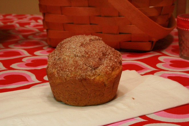 2. Spoon 1/3 cup batter into each muffin cup and bake until a toothpick inserted in center of a muffin comes out clean, 30 minutes. Meanwhile, in a medium bowl, combine granulated sugar and cinnamon. Let muffins cool 10 minutes in pan on a wire rack. Working with one at a time, remove muffins from pan, brush all over with butter, then toss to coat in sugar mixture. Let muffins cool completely on a wire rack.