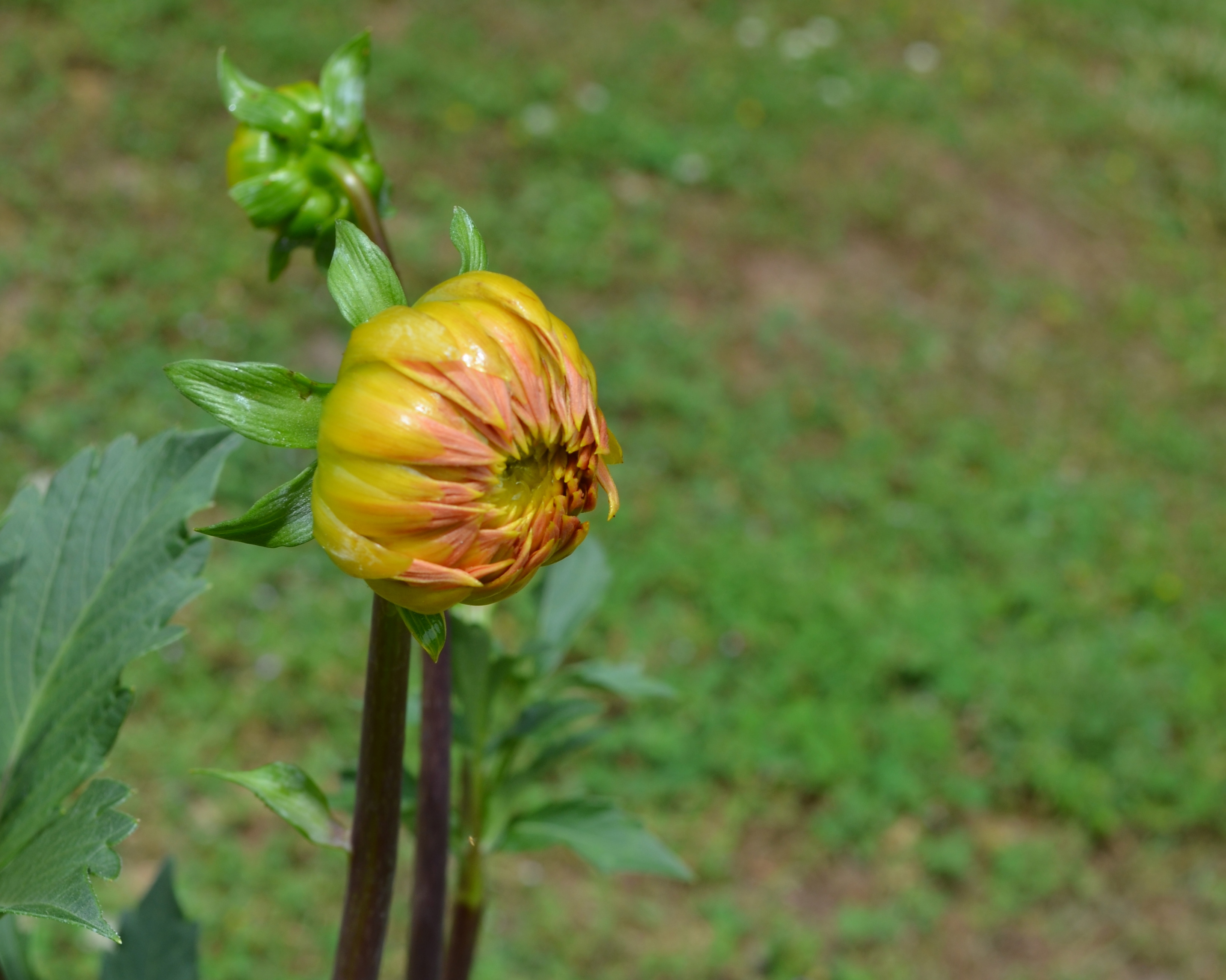 I moved down the yard to the bed where my blueberry bushes and my dahlias are… and I couldn’t help but feel tears well up… There, was a Dahlia bud, almost ready to crack open. But, it was very unique because of its size. It was humongous – and by that I mean it is the biggest, heartiest, soon-to-be blossom of a Dahlia I have ever seen, almost the size of a baseball. I am telling you the truth. And, here it was, glistening, soaking up the spray, in my bed.