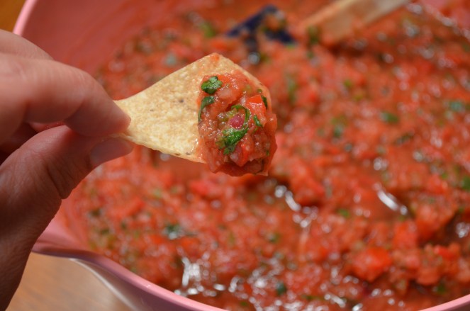 So, I’ll cut to the chase. You need this in your life and I’m giving you the recipe. You can vary the ingredients, add things to your taste, but in the end this will make your summer. It’s a fresh chip-full of salsa that you can not resist. Okay? good. You’ll love it!